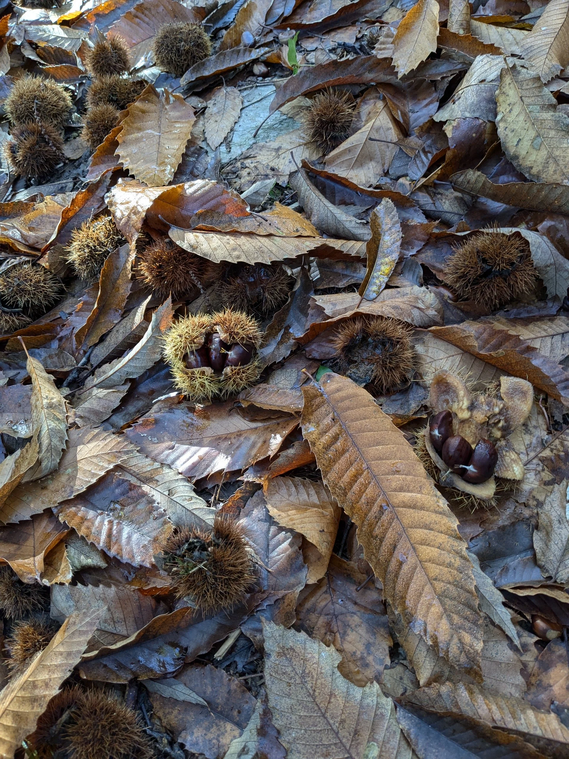 Today we see the remnant population of what would have been significant orchards on the terraces of the valley slopes. The chestnut tree has a “suckering” habit – it sends up shoots around the mother trunk. Often the ancient center of a tree will be hollow and dead, yet there are living parts rising from it. One sees many dead standing chestnut elders around farms today, as the people here revere them, understandably.